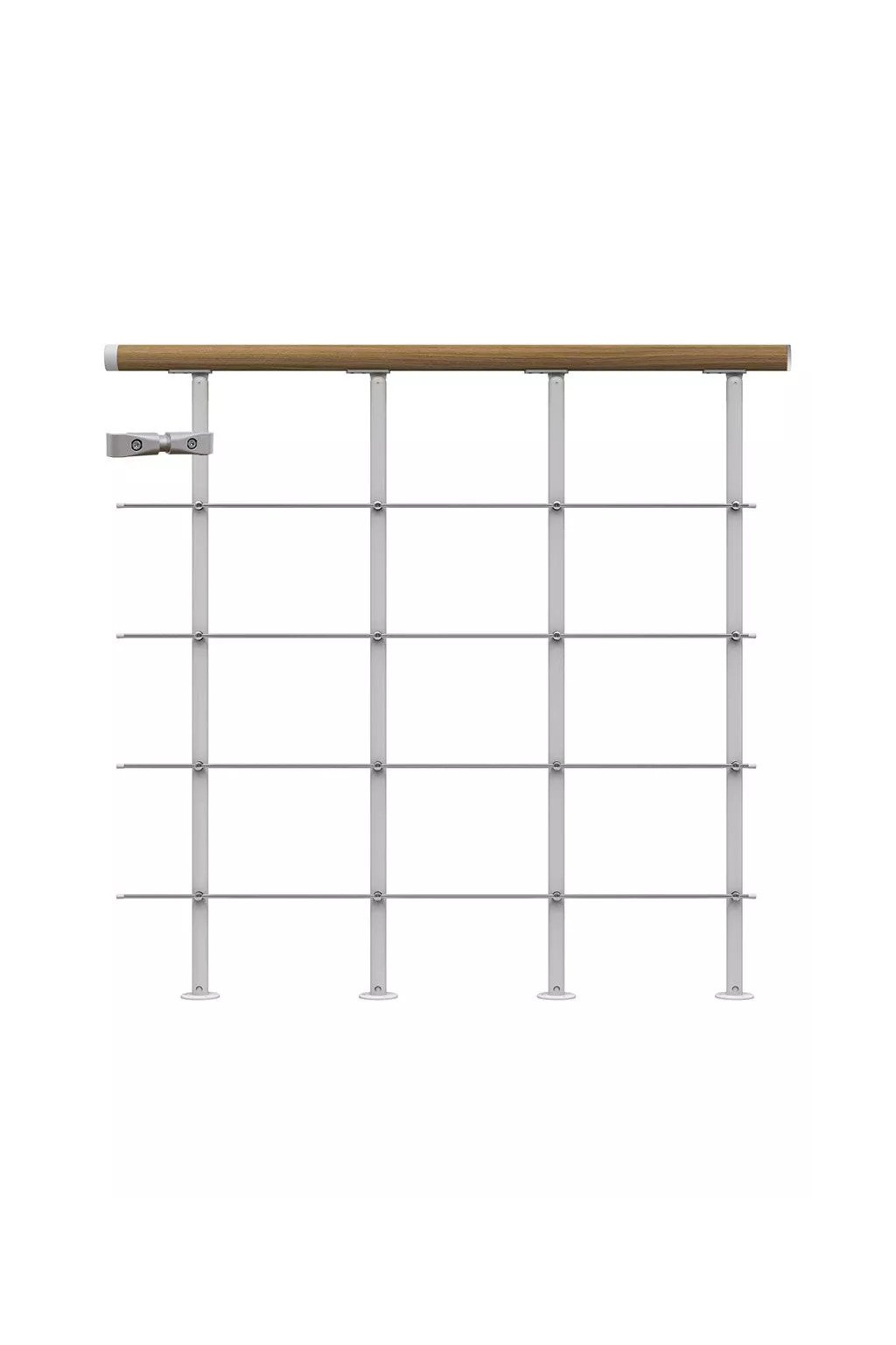 Zahajte instalaci s naší základní sadou (1 metr), která zahrnuje svorky pro uchycení zábradlí k schodišti. Pro dosažení potřebné délky můžete připojit další prodlužovací sady (1 metr).